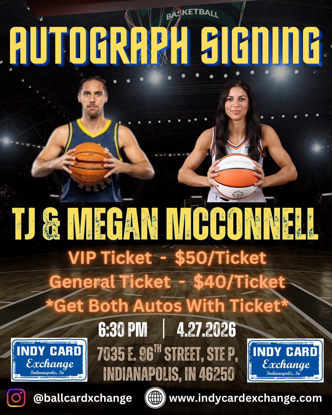 • Each ticket purchased gets you 1 autograph from Indiana Pacers basketball player, TJ McConnell and Indiana Fever basketball player, Megan McConnell. You can buy however many tickets you would like. You can have 1 or 2 guests come with you to the signing. You will only receive autographs for however many tickets you buy though.